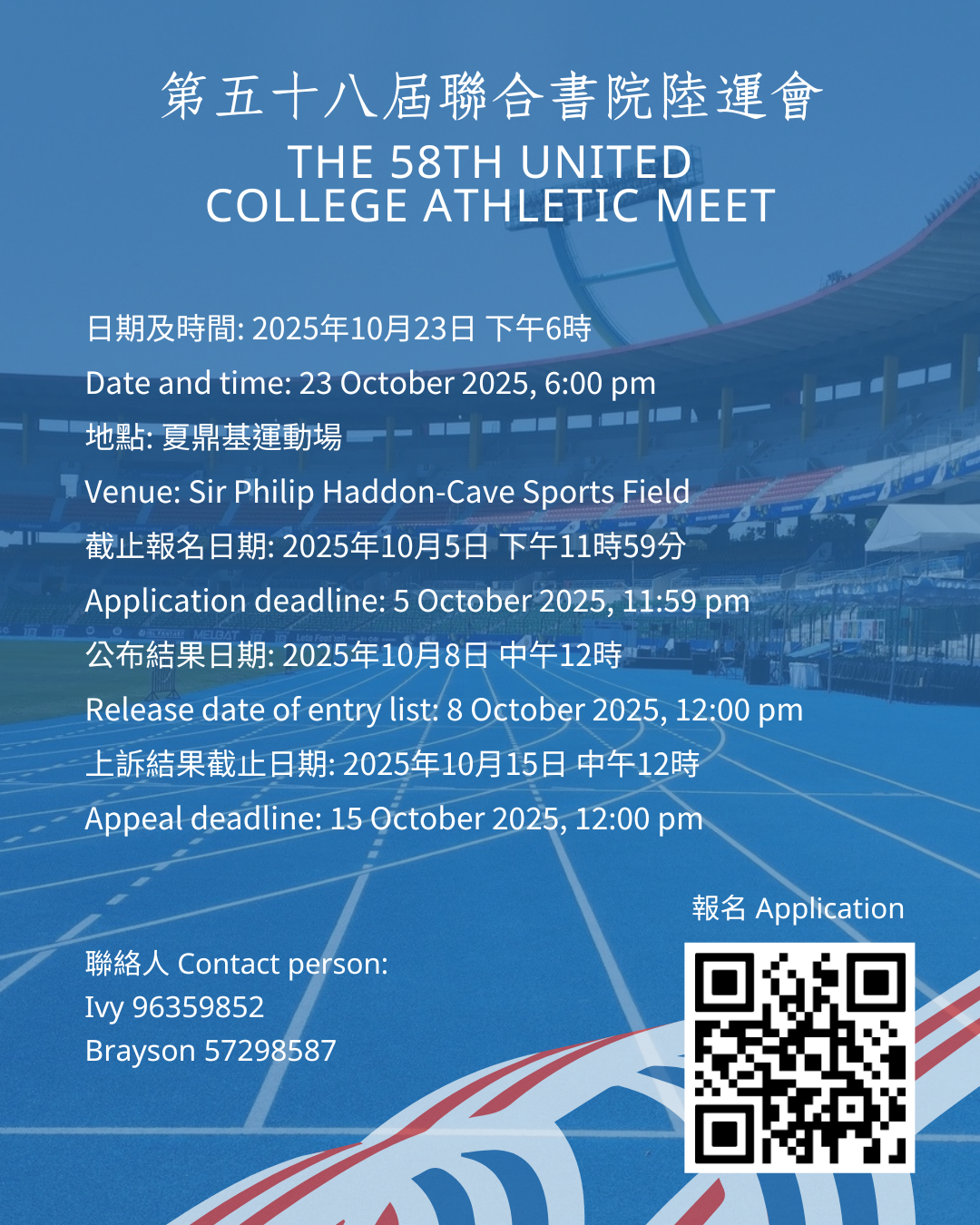 聯合書院第五十八屆陸運會將於2025年10月23日(星期四)晚上6時,於夏鼎基運動場舉行,歡迎聯合書院同學參加。大會只接受同學於網上登記參加比賽,請登入